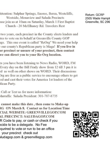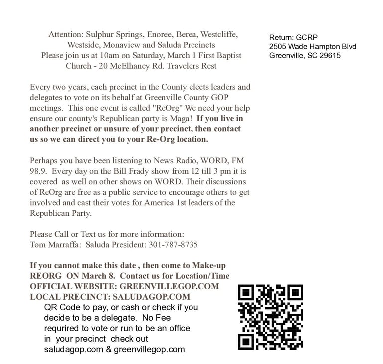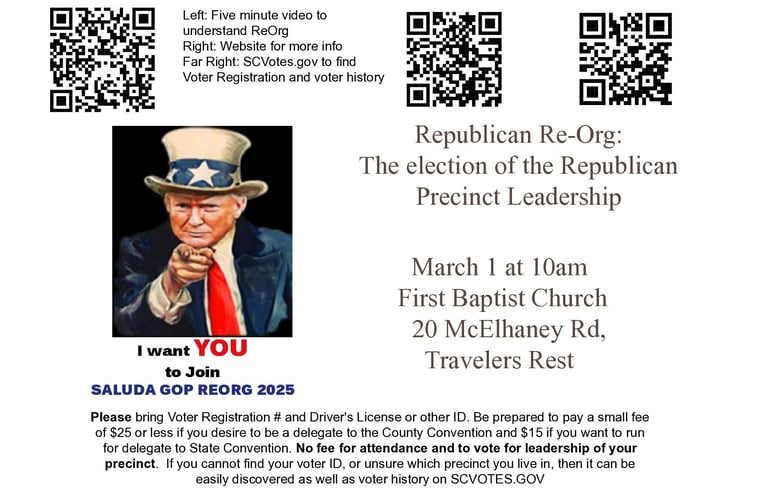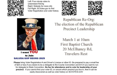 Please bring Voter Registration # and Driver's License or other ID. Be prepared to pay a small fee of $25 or less if you desire to be a delegate to the County Convention, and $15 if you want to RUN to be a delegate to the State Convention. No fee for attendance and to vote or run for leadership of your precinct. If you cannot find your voter ID, or unsure which precinct you live in, then you can easily discover that as well as voter history on SCVOTES.GOV. Your voter history is only important if you want to run as an Executive Committeeman (EC) or be a delegate to the State Convention. The requirements for these two items are voting in two of the last three Republican Primaries. These primaries were held in 2020, 2022, and 2024. The position of an EC is one who votes on your behalf at Greenville County Republican business meetings.
