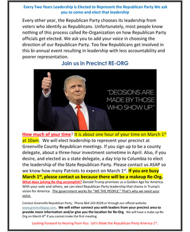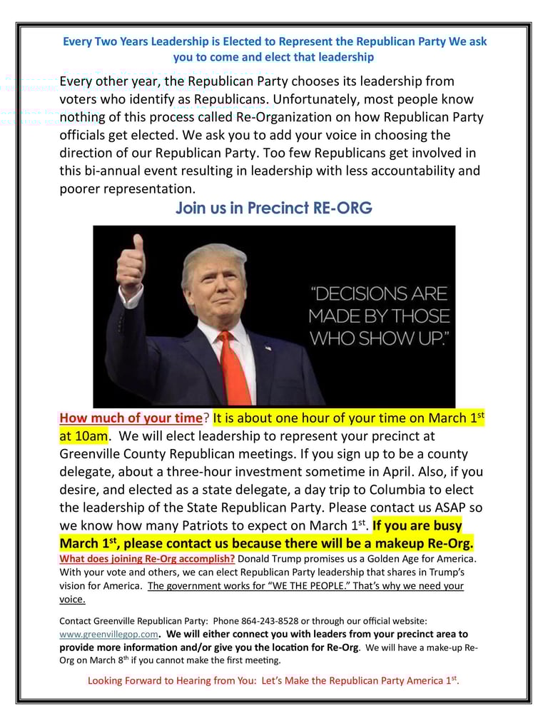 Though the Dates mentioned on this page are no longer relevant, the meaning of ReOrg is abundantly clear, and that is Make America Great Again. To do that, we must purge our government elected officials and our political parties of those who oppose the America 1st agenda that Donald Trump has put forth. There is still time to participate by becoming a delegate or simply be a guest to witness the election of America 1st patriots to lead the Republican Party. Come to Greenville County Republican Headquarters at 2505 Wade Hampton Blvd to sign up or call 864-243-8528 for more information.
