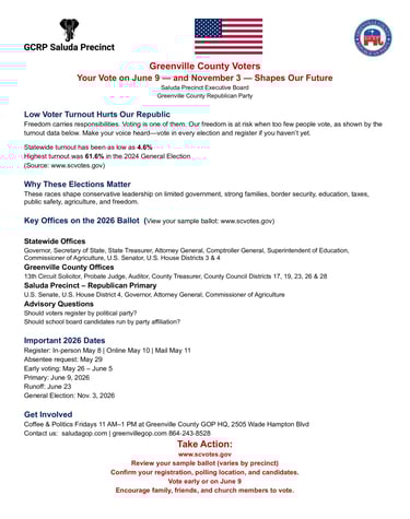 Saluda Precinct Specific Information: Much will be added- For now please refer to other pages as those pages do include information relative to Saluda Precinct, particularly the graphic below which can also be found on the Voting Page. Click on Picture if viewing is too small. I promise you, you won't want to miss what's coming. Check back frequently. Please contact us to let us know if we have an impact to get you or your friends to the polls, whether or not you wish to connect with us. We are and will continue to post on facebook and nextdoor and maybe even X about the importance of this SACRED FREEDOM DUTY TO ENGAGE IN THE VOTING PROCESS. If you come across one of our posts, please like and share and comment (commenting increases reach on Facebook). We don't care if you connect, just vote. However, connecting with our Party and your Precinct is needed if we are to continue the fight to make America Great Again. For 2027 every Precinct elects new officers to lead this effort. Becoming an officer is not all that difficult and being a member takes even less effort.