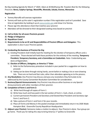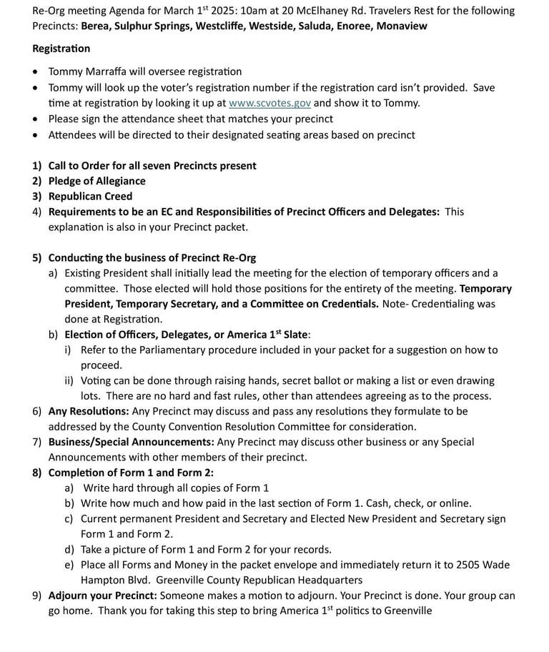 County Convention: April 14th at the Palmetto Expo Center, 1 Exposition Dr. Greenville 29607. Doors open at around 4pm for the Convention at 6pm.